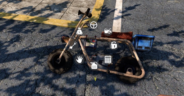 Motosiklete binmek için E tuşuna basmamız gerekir. E tuşuna uzun süre basarsak bir tür özelleştirebileceğiniz ikonlarla karşılaşırsınız. Üzerinde para simgesi olan çuval ikonu 27 birim daha envanter bölümüdür. Üzerinizdekileri buraya koyabilirsiniz. Kaput ikonu ise motosiklete ek modifikasyonlar takabileceğiniz rengini değiştirebileceğiniz, onarma işlemi ve yakıt doldurma işlemi gerçekleştirebileceğiniz bölümdür.