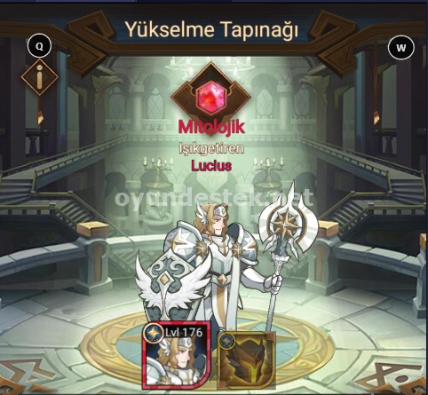 Resimde gördüğünüz gibi Işık taşıyanlar grubunda yer alan Lucius’u Mitolojik+ seviyesine yükseltebilmemiz için herhangi bir Işık taşıyan Efsanevi+ kahraman yeterlidir.