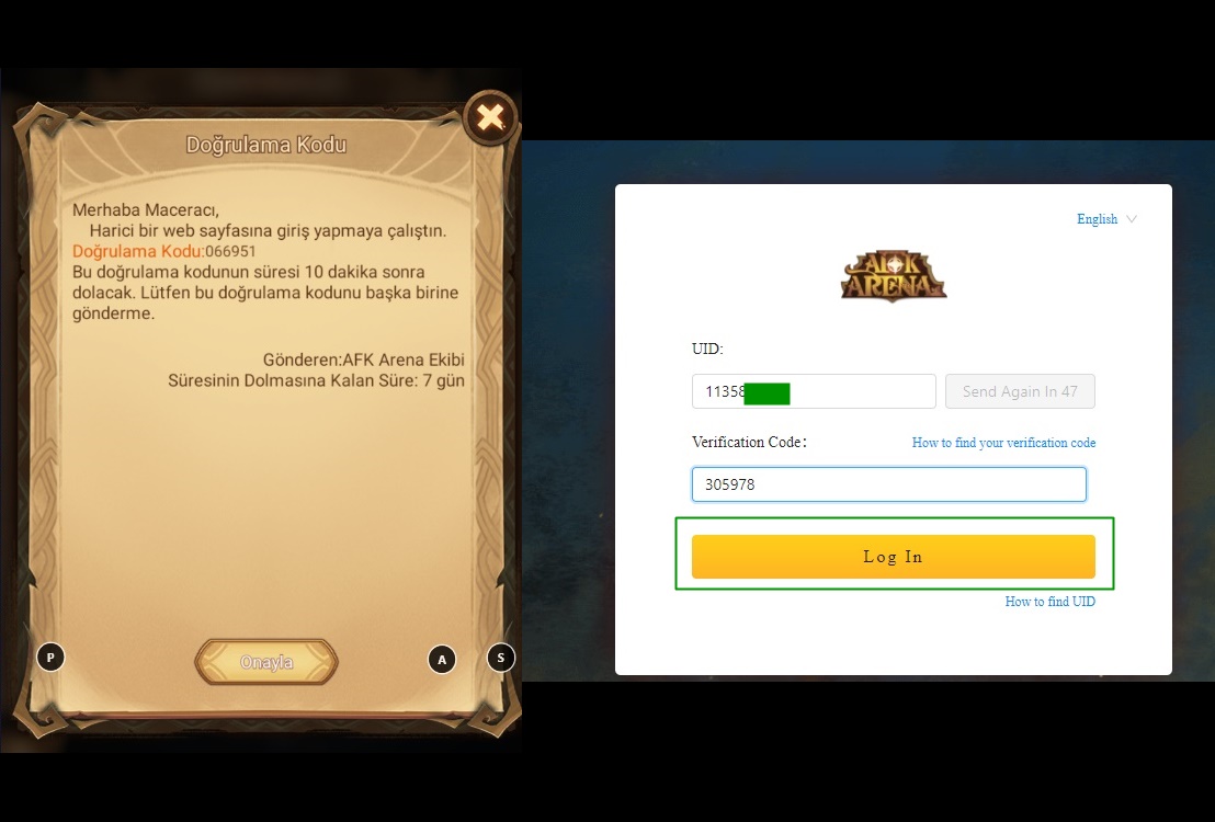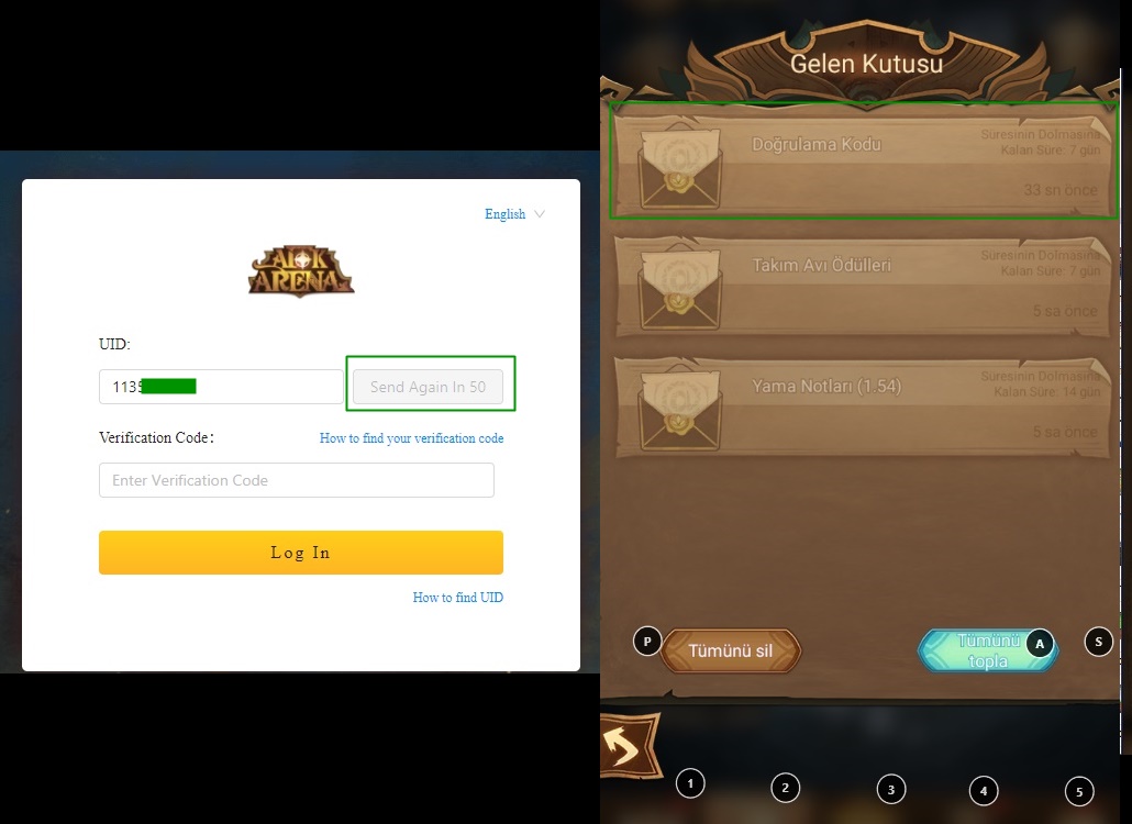 UID’mizi yazdıktan sonra “Send Code” butonuna basıyoruz. Ardından Oyun ekranını açıp Gelen kutusuna giriyoruz ve gelen doğrulama mesajını açıyoruz.