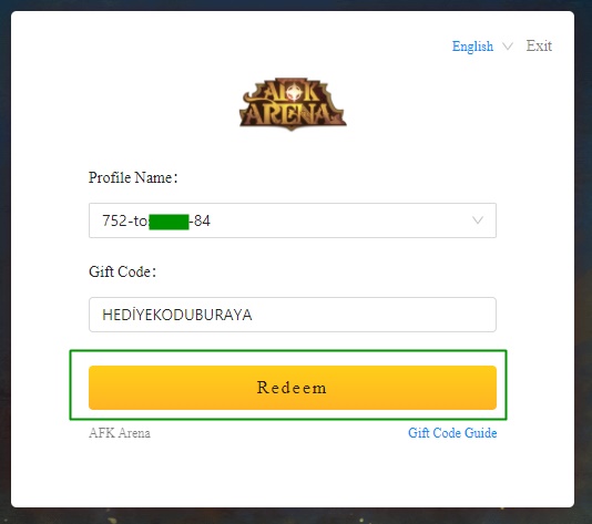 Hediye kodunuzu girdikten sonra Redeem diyerek seçili profilinize hediyeyi gönderebilirsiniz. Aynı hesapta birden çok serverda oynuyorsanız hepsini Profile Name kısmından seçerek Redeem demelisiniz.