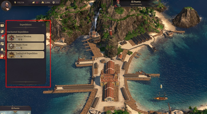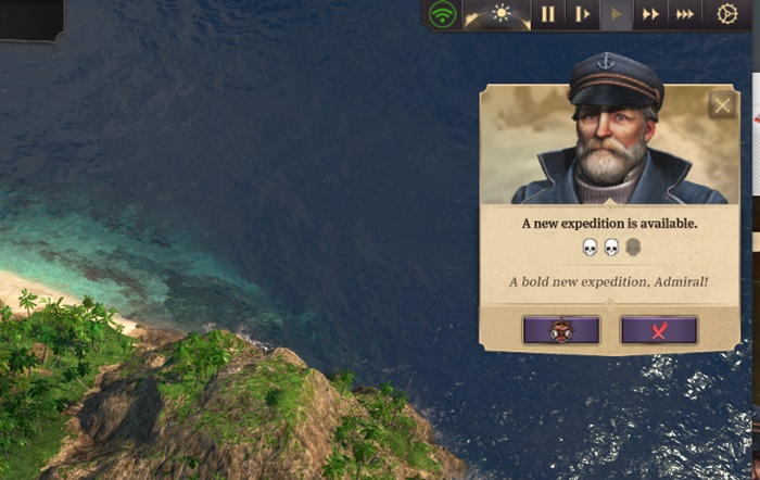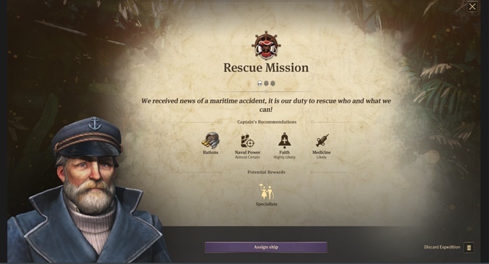 Göreve başlamak için oyun ekranın sol orta kısmında bulunan ikonlardan gemi dümenine tıklamanız aktif keşif görevlerini görmenizi sağlayacak olan Expeditions menüsünü açacaktır. Burada henüz bir keşif yapmadığınız için size yeni dünyayı keşfetme görevi verilecek. Göreve tıklayın.
