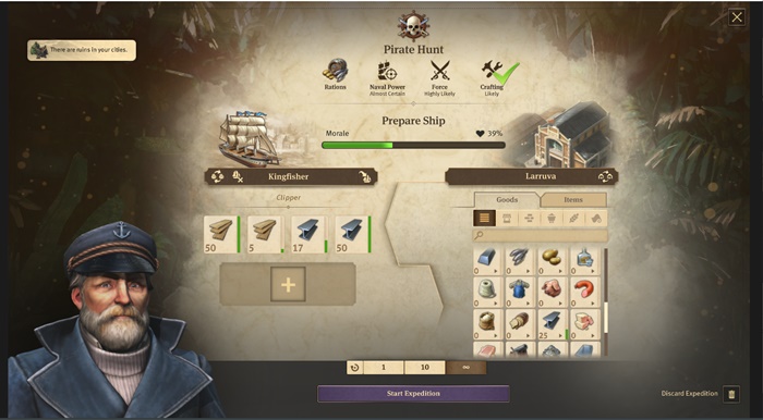 Geminin morali keşif görevi sürecinde oldukça önemlidir. Morali yükseltmek için NPC adalarından Ticaret belgeleri alıp gemiye takabilirsiniz. Ayrıca Odun, çelik gibi eşyalar gemi mürettebatının moralini yükseltecektir. Olası bir fırtına esnasında ayrıca bu eşyalar gemiyi onarmaya da yarayacak, görev sırasında ek moral kaybını engelleyecektir. Hazırsanız Start Expenditions diyerek görevi başlatalım.