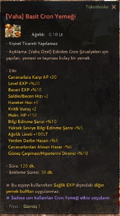 Basit Cron yemeği Bilgi edinme şansınızı %10 arttırır. Ayrıca yüksek seviye bilgi edinme ihtimalinizi de %5 arttıracaktır. aktiflik süresi ise 120 dakikadır.