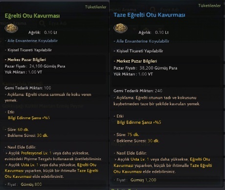 Eğrelti otu kavurması ve Taze eğrelti otu kavurması yine bilgi edinme şansını arttıran yemeklerdir. Fiyatları düşük olan bu yemekler 60dk veya 75 dk boyunca %5 bilgi edinme şansını arttırır.