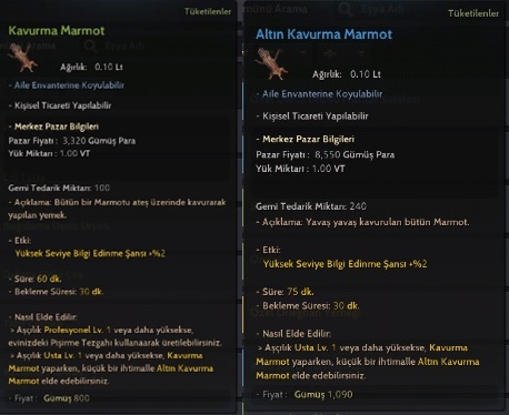 Marmot Kavurma veya Altın Marmot kavurma Yüksek seviye bilgi edinme şansınızı %2 arttırır. Yine yemeğin kalitesine bağlı olarak 60-75 dakika boyunca etkili olacaktır.