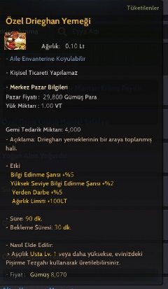 Özel Drieghan yemeği bilgi edinme seviyenizi %5, Yüksek seviye bilgi edinme şansınızı %2 olacak şekilde 90 dakika boyunca arttırır.