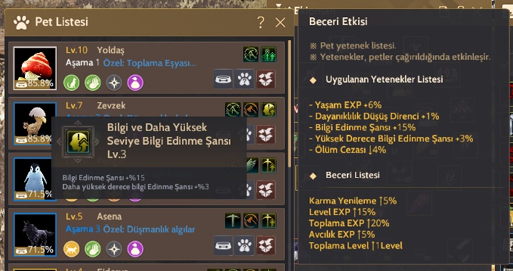 Bazı petlerde seviyesine göre özellik verecektir. Bu özelliklerden bilgi edinme şansı arttıran özellik yeteneğinizi arttıracaktır. Unutmadan ekleyelim; Petlerin karnı tok olmaz ise özellikleri kullanamazsınız.