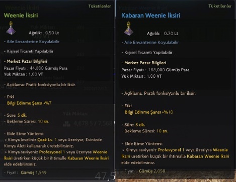 En ucuz maliyetli iksir Weenie İksiri’dir. %7 bilgi edinme seviyenizi 5 dakika boyunca arttırır. Kabaran Weenie İksiri ise %10 bilgi edinme seviyenizi 8 dakika boyunca arttıracaktır.