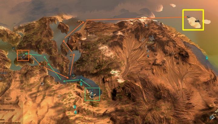 Mavi ile gösterilen yer gemiden indiğimiz yer. Sarı ile gösterilen yere kadar ilerlememiz gerekiyor. Burası adanın en yüksek noktası ve düşük level iseniz kesinlikle karakter ölecektir.