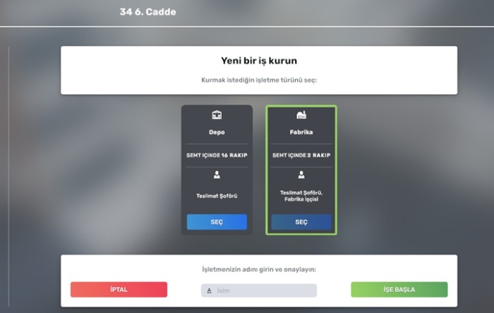 Fabrika kurulabilir binalar şuan için yalnızca depo binalarıdır. Depo kiralayıp yada mülkiyetini satın alırsanız binanın iş kurma ekranında depo yerine fabrika olarak hizmet vermesini seçebilirsiniz.