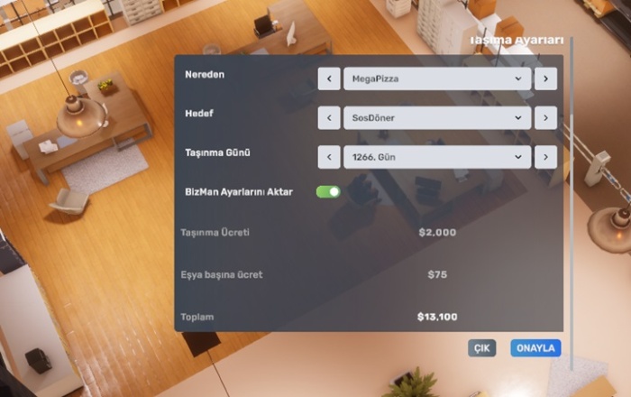 Taşıma şirketi temsilcisiyle görüştüğünüzde Nereden seçeneğine mevcut işletmenizi, hedef seçeneğine yeni kiraladığınız yada satın aldığınız işletmeyi, taşıma gününe taşıma işleminin ne zaman yapılacağını, Bizman ayarları ise işletmenin çalışma saati tabela gibi ayarlarının yeni yere aktarılıp aktarılmayacağını seçip onayla diyerek taşıma işlemini başlatabilirsiniz.