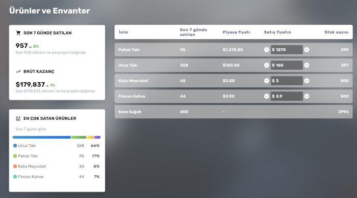 7 Günlük ciroda görüleceği gibi 180 bin dolarlık satış gerçekleştirebiliyoruz. Oyunun en karlı iki işletmesinden biridir. Bu nedenle hikaye modunda ilerlemenizi gerçekleştirdikten sonra mutlaka kuyumcu mağazası açmalısınız.