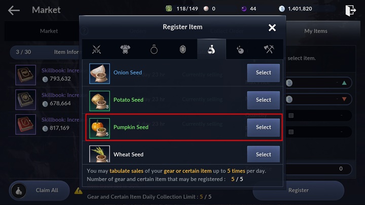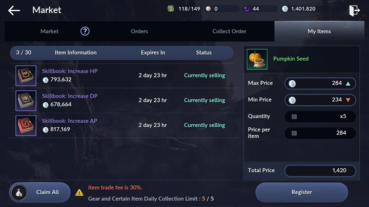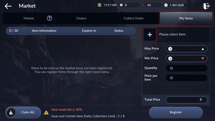 Sonraki ekranda en düşük ve en yüksek market fiyatı, kaç adet satmak istediğinizi ve ne kadara satış yapacağınızı gösterecek. Son olarak Register diyerek itemi markette listeleyin.
