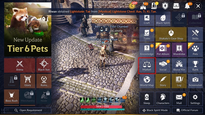 Black Desert Mobile oyunda merkez pazar sistemi üzerinde elde ettiğiniz eşyaları nasıl satacağınızı resimli olarak aktaracağız. Öncelikle menü tuşuna basarak Merkez Pazar simgesine tıklayıp pazarı açın.
