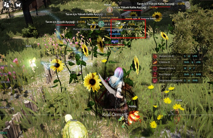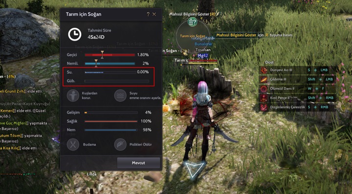 Tarlaya ektiğiniz ürünlerin ilerleme durumu %100 olduğunda artık hasat edilebilir. Bir ürünü hasat etmek için ona yaklaşıp “R” ile hasat işlemini başlatabilirsiniz.