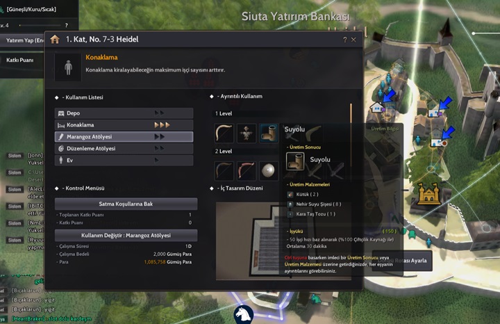 Şehrinizdeki evlerden Marangoz Atolyesi yapılabilir bir evi kiralayarak suyolu üretebilirsiniz. Marangoz evi 1. seviyede 2 kütük, 8 nehir suyu şişesi ve bir kara taş tozu ile 1 adet suyolu üretebilirsiniz. Bu hem katkı, hemde yer bakımından size faydasız olacak bir işlem bunun yerine kendiniz sulamayı tercih etmelisiniz.