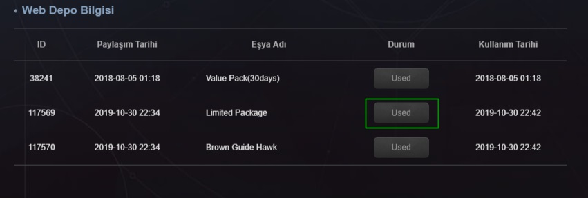 Burada satın aldığınız ürün ve tarihler gözükecektir. Buradan işaretlenen alandaki “Use” butonuna tıkladığınızda satın aldığınız ürünler oyun içi posta kutunuza gelecektir. Oyun ekranına dönüp “B” tuşuna bastığınızda satın alımını gerçekleştirdiğiniz ürünleri teslim alabilirsiniz.