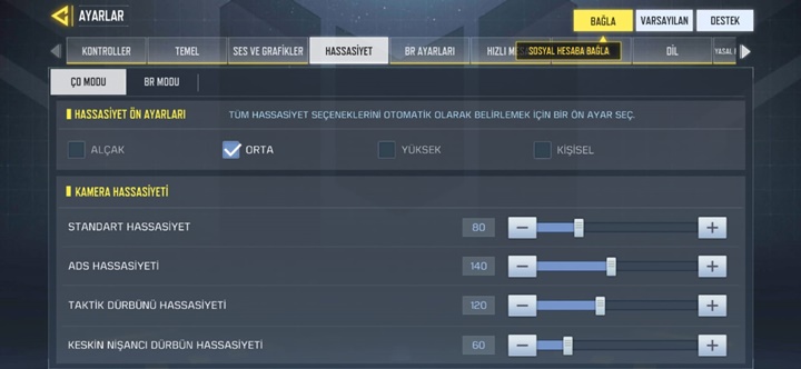 - Orta Seviye; Hassasiyet ayarlarının en dengeli olduğu ve oyunun tavsiye ettiği bu hassasiyet ayarları kamera hassasiyeti, ateş etme hassasiyeti ve kullanıyorsanız cayroskop hasssasiyeti olmak üzere üç bölümden oluşur.