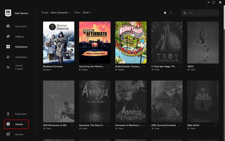 Bunun için yapmanız Epic Games Launcher’i açın, ardından Ayarlar kısmına tıklayın.