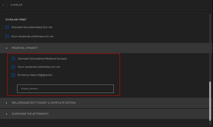 Oyunları Yönet kısmından yüklü olan oyun listesini göreceksiniz. Buradan Medieval Dynasty tıklayarak genişletin.