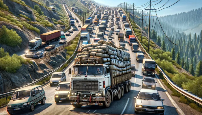 Euro Truck Simulator 3 için ağır yük nakliyatı temalı, yokuşlu bir yolda tırmanmaya çalışan eski bir tırın olduğu, trafik sıkışıklığının da hissedildiği bir sahneyi hayal etmek oldukça heyecan verici! Bu sahne, oyunun zorluklarını ve sürücülerin karşılaştığı çeşitli engelleri vurgulayacak şekilde tasarlanabilir. Eski tır, ağır yüküyle mücadele ederken, etrafta diğer araçlar da zorlu yokuşta ilerlemeye çalışıyor olabilir. Bu, oyuncuların beceri ve sabrını sınayan, gerçekçi bir simülasyon deneyiminin özünü yakalar.
