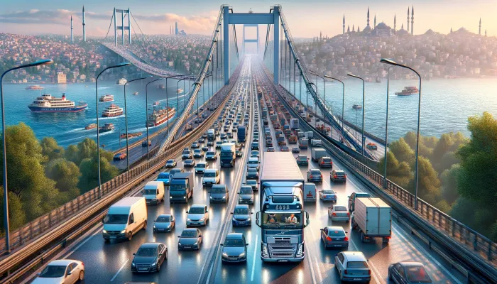 Tır sürücüsünün bakış açısından, ön camdan görünen trafik ve köprünün ihtişamı, Euro Truck Simulator 3’ün Türkiye yollarındaki deneyimini yansıtacak biçimde vurgulanabilir. Bu detaylar, oyunun sürükleyiciliğini ve çeşitliliğini gösteren gerçekçi bir atmosfer oluşturur.