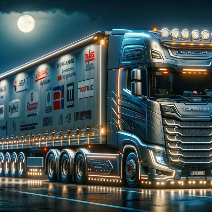Ve işte, dorseli bir tırın hayalini kurduğumuz Euro Truck Simulator 3 sahnesi! Bu görselde, tırın modern ve aerodinamik tasarımını, etkileyici LED farlarını ve arkasındaki geniş dorseyi görebilirsin. Dorsedeki çeşitli firmaların logoları, oyunun taşımacılık yönünü ve yük çeşitliliğini vurguluyor.