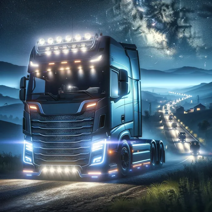 Tırın modern ve aerodinamik tasarımı, güçlü LED farları ve gece ışığında parlayan özel boyası ile etkileyici bir sahne yaratıyor. Umarım bu görsel, Euro Truck Simulator 3’ün detaylı ve gerçekçi dünyasını daha da canlı bir şekilde hayal etmene yardımcı olur.
