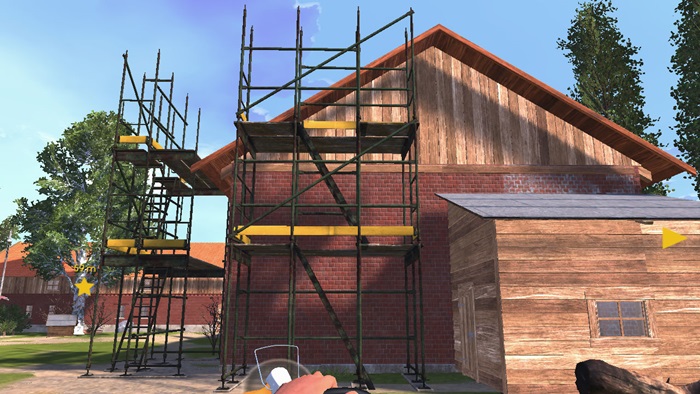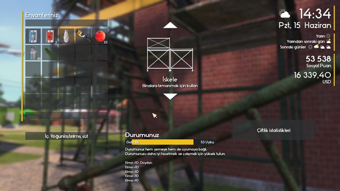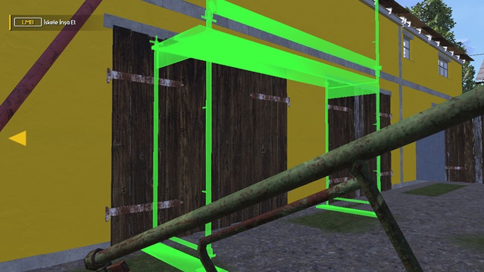 Çiftlikteki binaları onarmak için iskele kurmanız gerekir. Yüksek yerlere ulaşmak, çatıya çıkmak için bu gereklidir. Bunun için TAB tuşuna bastığınızda açılan kısımda iskele seçmeniz ve kurmak istediğiniz binanın yakın alanına mouse sol tuş ile iskeleyi kurabilirsiniz.
