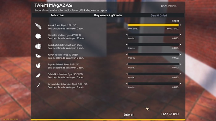Açılan panelde ki sekmeler aracılığı ile tarlaya ekeceğiniz ürünler için tohumlar, gübre, sera için sebze ve meyve fideleri, ahırda bakabileceğiniz inek, kaz, ördek gibi hayvanlar ve kümeste bakacağınız tavuk satın alabilirsiniz. Ayrıca bir çiftliğin vazgeçilmezi olan kedi ve köpek yine buradan satın alabileceğiniz dostlarınız olacak.