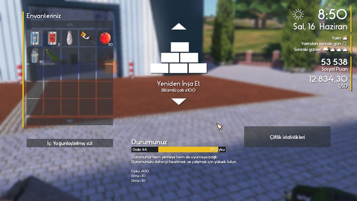 Böylece çiftliğe dönmüş olacaksınız. Elinizdeki malzeme 100 birim kadardır. Malzeme tükendiğinde aynı yöntem ile bina deposuna giderek malzeme satın alıp tekrar aynı yöntem ile çiftliğe dönüş yapabilirsiniz. Son olarak TAB tuşu ile aldığımız malzemeyi kullanılabilir kılalım ve istediğimiz binaya uygulayalım.