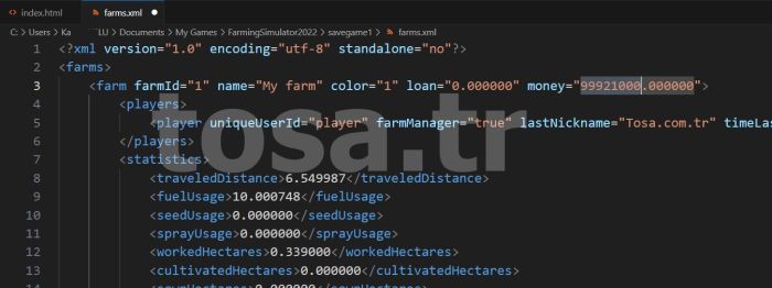 Daha sonra Belgeler > My Games > Farming Simulator 2022 > Savegame1 klasörünü açın içerisinde yer alan farms.xml dosyasını not defteri ile birlikte açarak aşağıdaki resimde gördüğünüz değeri düzenleyin.