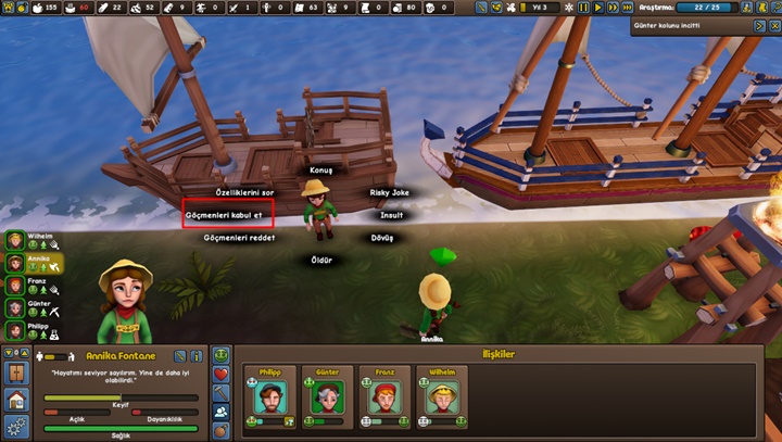 Yeni yerleşimciler geldiğinde ekrana bir bildirim çıkacak. Mülteci gemisi sahile yanaşmış olacak.