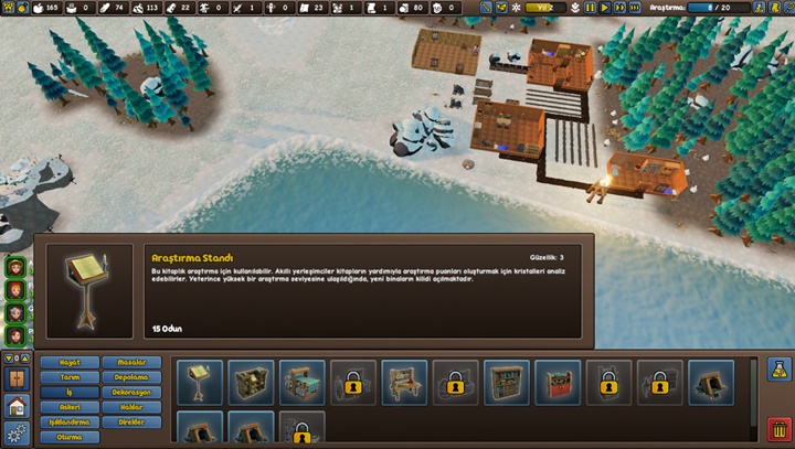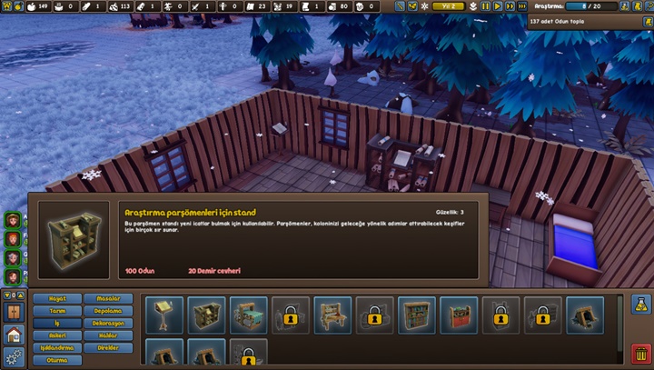 Bir yerleşimciyi araştırmacı olarak atamak için İş > Araştırma standı eşyasını bir evin içerisine yerleştirin.