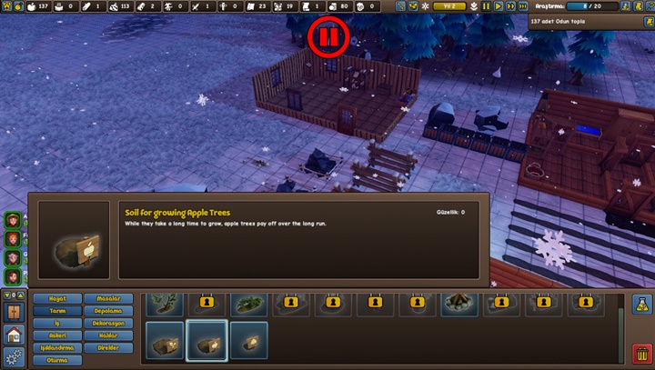 Yeterli beceriye ulaşan bir yerleşimci olduğunda ve Çiftçilik beceri 1 isimli araştırmayı tamamladığınızda artık elma ağacı için gerekli alanı belirleyip elma ağacını dikebilirsiniz.