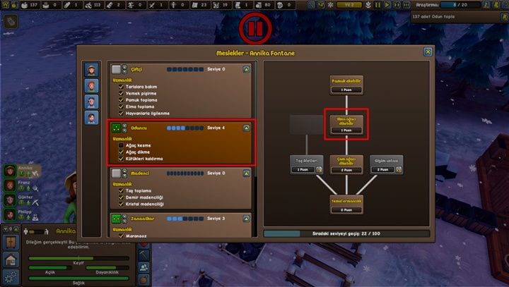 Ağaç dikmek için gerekli alanı oluşturmaya yarayan Çiftçilik 1 araştırmasını yaptıktan sonra yerleşimcilerinizden birini odunculuk üzerine vermelisiniz. Odunculuk becerisi 3.seviyeye gelen yerleşimcinin becerilerine göz atarak Elma ağacı dikme becerisini geliştirmelisiniz.