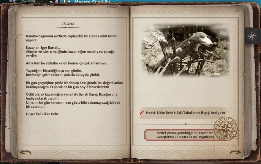 Yine Behr’in etrafında bulunan Kanada Geyiği keserek etini toplamanız durumunda ilk sayfa tamamlanacaktır. Sayfanın tamamlanması için 1 adet et toplamanız kafidir.