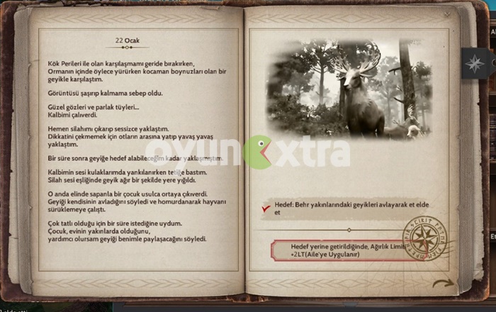Yine Behr’in etrafında bulunan Kanada Geyiği keserek etini toplamanız durumunda ilk sayfa tamamlanacaktır. Sayfanın tamamlanması için 1 adet et toplamanız kafidir.