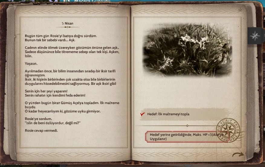 Sizden istediği 5 adet gümüş açelya toplamanızdır. Malzeme satıcısından herhangi bir kalitede çapa satın alarak Yabani Otları toplayıp görevi kolayca yapabilirsiniz. 5 adet gümüş açelya elde ettiğinizde sayfayı tamamlamış olacaksınız ve ailedeki her bir karakterinize +3 HP eklenecek.