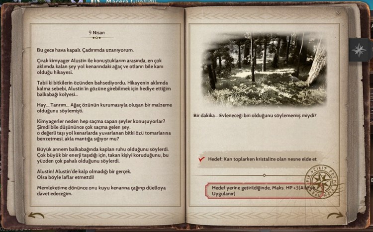 Bu sayfa görevinde kristalize kan toplamanız isteniyor. Malzeme satıcısından herhangi bir kalitede sıvı toplayıcı satın alın. Ardından geyik, tilki, kurt farketmeksizin hayvan öldürüp kan toplamaya başlayın. Bir süre tekrarladığınızda kristalize kan elde edeceksiniz ve görev tamamlanacak. Bu sayfanın ödülü +3 HP olarak aildeki bütün karakterlere uygulanır.