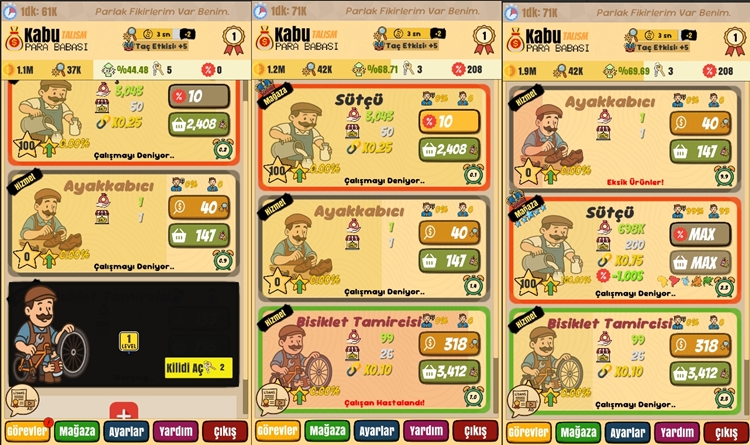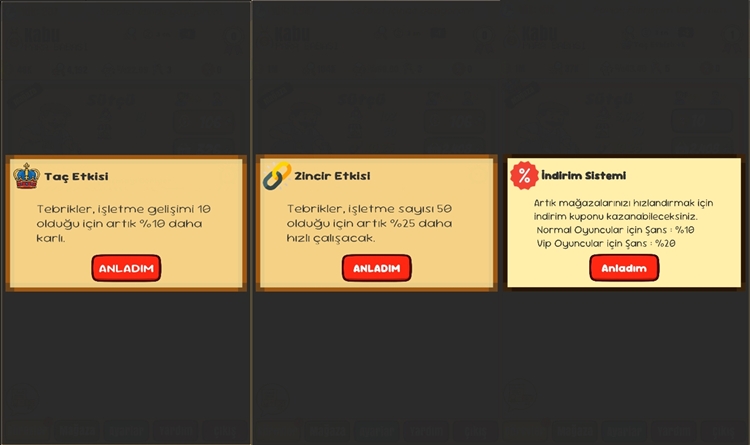 Yukardaki ekran görüntüsünde 3 farklı kare var. İlk bölümde yeni kurulan bir işletmenin kilidinin açılması gerekir. Bu kilidi, Anahtar ile açabilirsiniz. Anahtarları, her level atladığınızda ve görevler aracılığı ile elde edersiniz.