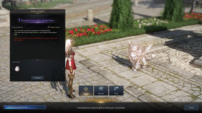 Oyuna başladığınız şehirde(Prideholme) ana göreve devam ederken, şehir merkezine geldiğinizde mor renkli bir ikon haritada göreceksiniz. Bu ikonun olduğu yere gittiğinizde NPC Blueberry ile konuşup Pet görevine başlayabilirsiniz.