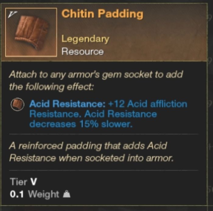 Hem bu 50 rakamını yükseltmek, hem de suya girdiğimizde bu puanın düşüş hızını yavaşlatmak için kullanabileceğimiz bir taş bulunur. Chitin Padding gemini elbiselerinize takara +12 Asit dirençi kazanırsınız. Ayrıca puan düşüş hızını %15 azaltacaktır. Her bir parçada bu etkileri kazanabilirsiniz.