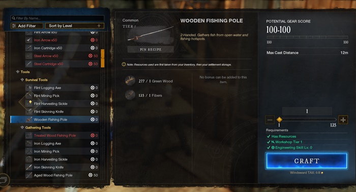 New World dünyasında da balıkçılık yapabilirsiniz. Bunun için 1 adet olta sahibi olmanız yeterlidir. Oyunun en basit oltası, Wooden Fishing Pole sahibi olmanız için 1 adet herhangi bir çalıdan toplayacağınız veya Young Tree ağacını keserek elde edebileceğiniz Green Wood ve 1 adet Fibers için hemp toplaması yapabilirsiniz.