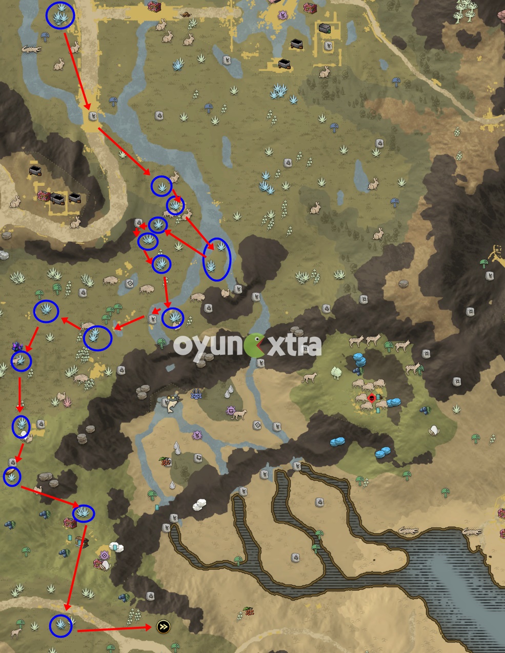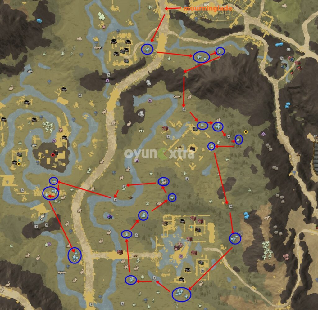 Mourninglade merkezinden çıktıktan sonra kırmızı ok işaretleri ile aynı yönde ilerleyerek ilk olarak Menkar bölgesine yakın olan silkleri topluyoruz. Ardından hemen karşısında ve timsahlar ile domuzlar tarafından korunan silkleri topluyoruz. Daha sonra Karaka bölgesinin yakınındakileri almak için aşağı atlıyoruz ve o bölgedeki silkleri topluyoruz.