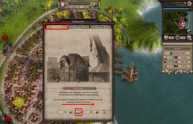 Limanda demirleyen gemiyi seçtikten sonra taverna binasına tıklayın. Ardından “Sailors” sekmesinin altında kiralayabileceğiniz denizciler gözükecektir. Ok işareti kısmına tıklayarak denizcilerin gemiye binmesini sağlayabilirsiniz.