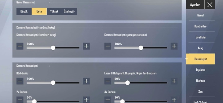 Oyunun Önerdiği Hassasiyet Ayarları;Oyun geliştiricilerinin bizler için düşündüğü çok ince bir davranış olan hazır konumda bulunan 3 farklı seçenekte hassasiyet ayarı mevcuttur. Bunlar düşük, orta ve yüksek olmak üzere hazırlanmış hassasiyet seviyeleridir. Dilerseniz bu hazır seçeneklerden bir tanesini seçerek oynayabilirsiniz. Bu kısımdan orta seviyedeki hassasiyet ayarlarını seçmenizi tavsiye ederim düşük veya yüksek seçimleri ilk başlarda sizin için çok hızlı veya yavaş gelebilir.