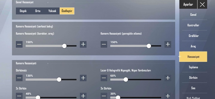 Serbest Bakış için;Kamera Hassasiyeti(Karakter, Araç)/ %150Kamera Hassasiyeti(Paraşütle Atlama)/ %150