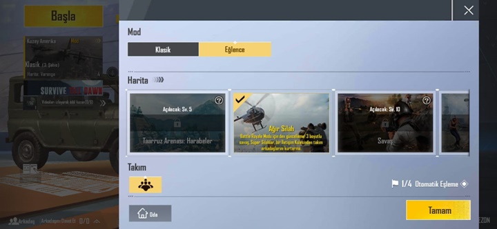 Oyunun kurumu ve gerekli güncellemeleri tamamlandıktan sonra, giriş ekranındaki sol üst köşede başla butonunun hemen altında bulunan kısıma dokunarak mod ve harita seçim bölmesine erişim sağlayabilirsiniz.