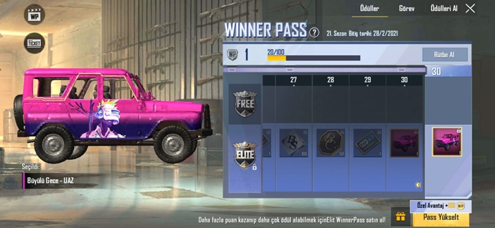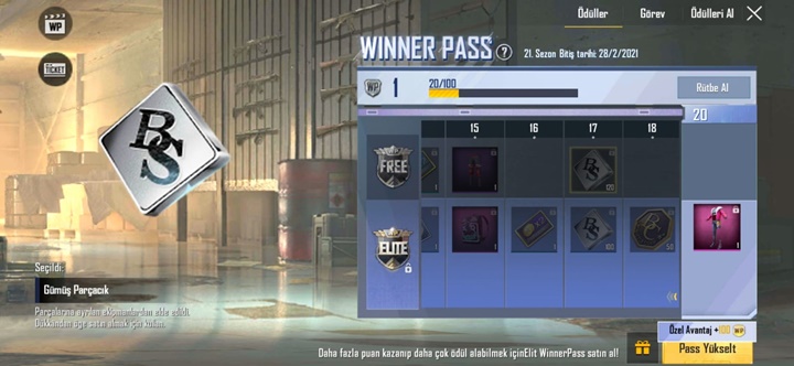 Bu görevleri tamamlayarak bu ödüllere sahip olunur. Daha düşük özellikli cihazlara sahip olan insanların normal oyunculara oranla oyuna daha az bütçe ayırabileceğini düşünen oyun yapımcıları Royale pass la arasında çok fark olmasada kısmen olarak daha düşük miktarlara bu etkinliği sizlere sunmaktadır. Yine Royale Pass görevlerinde olduğu gibi ücretli ve ücretsiz ödüller olmak üzere 2 grupta yapılabilmektedir. Winner Pass’a yükselten oyuncular bütün ödüllere erişebilirken, hiç yükseltme yapmayan oyuncular ise sadece ücretsiz ödüllere erişim sağlamaktadır.